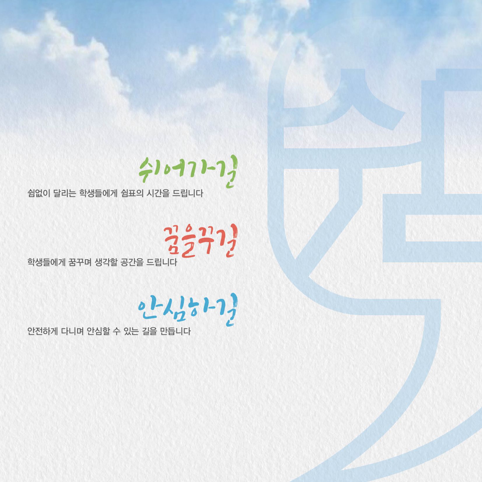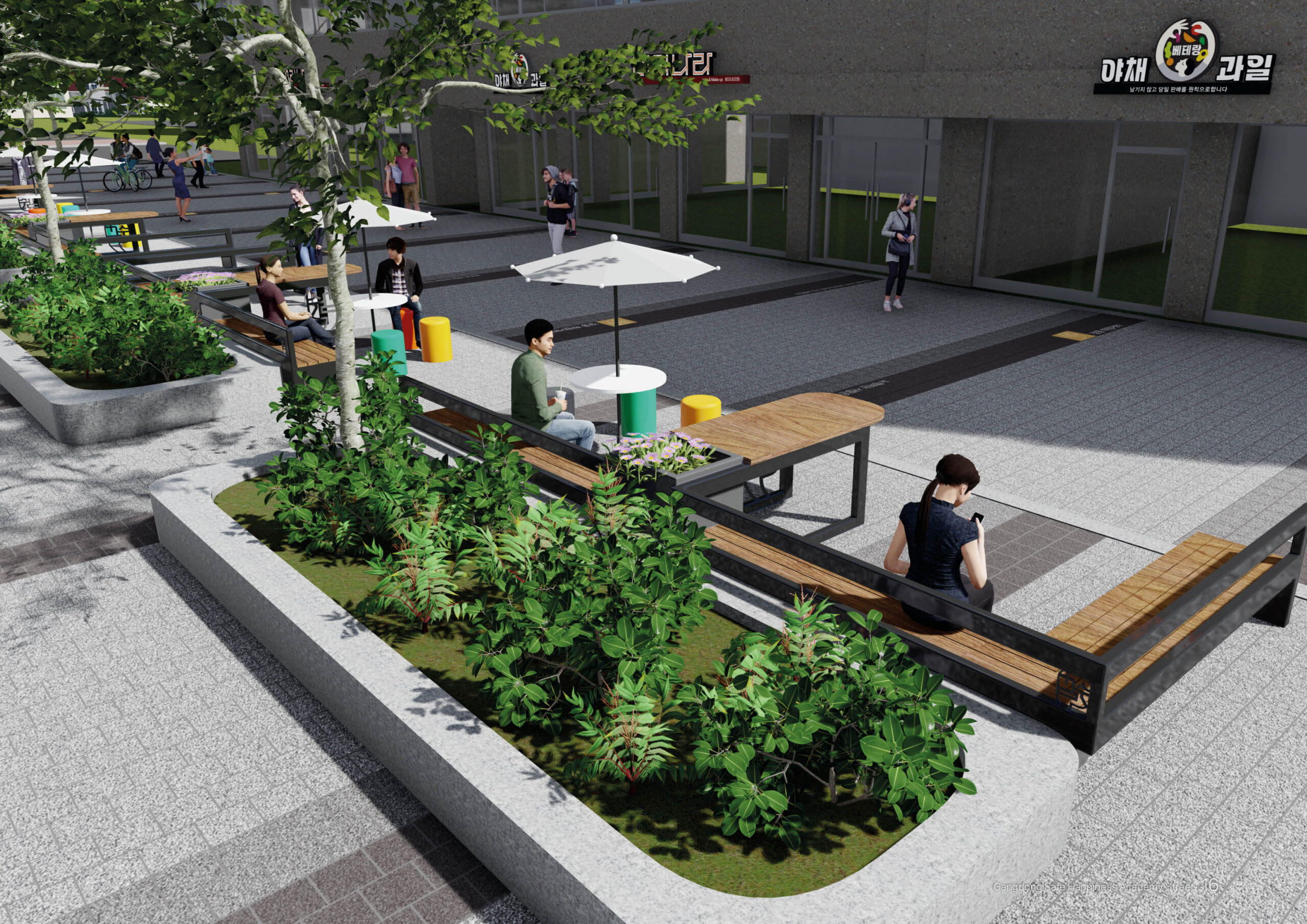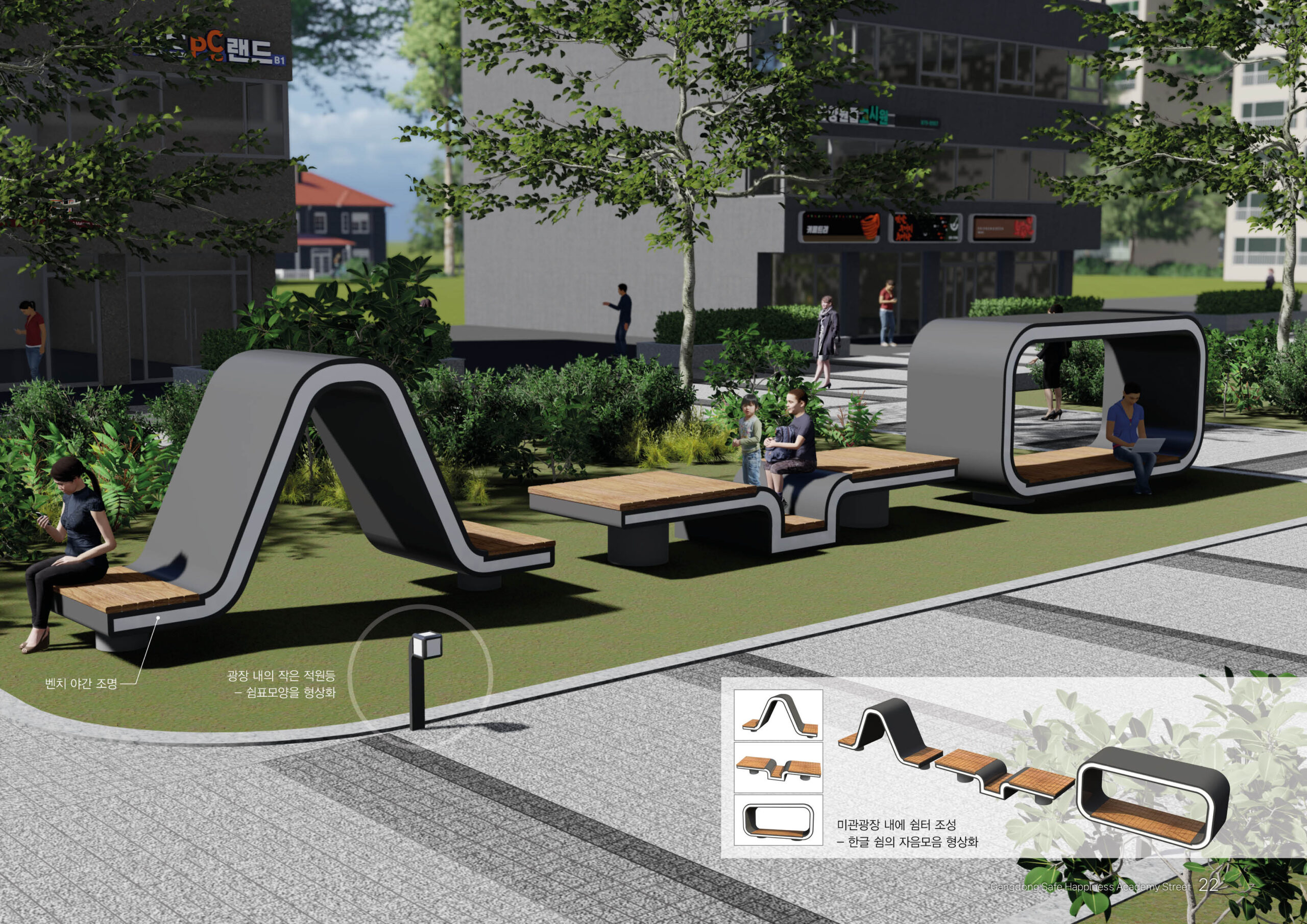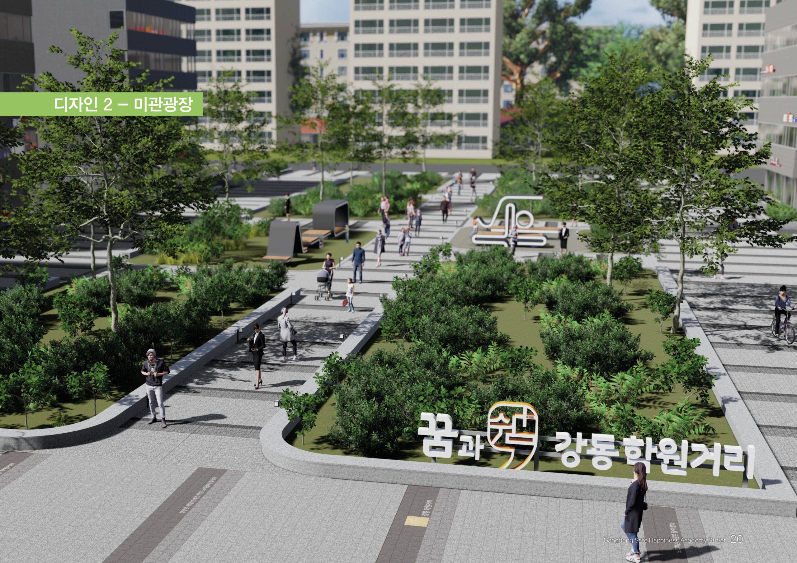 명일동 미관광장 일대는 학생들을 위한 교육시설이 많아 학업에 지친 학생들이 오며가며 쉬어가는 휴식처를 만들어 안전하고 쾌적한 경관을 만들고자 합니다.