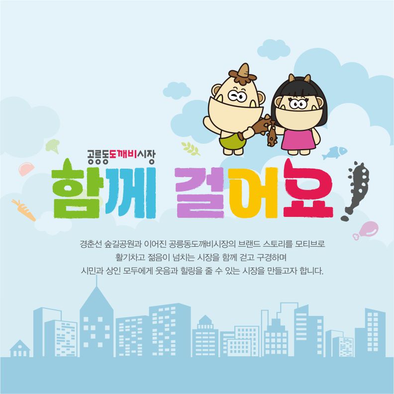 경춘선 숲길공원과 이어진 도깨비시장의 브랜드스토리를 모티브로 활기차고 젊음이 넘치는 시장을 함께 걷고 구경하며 시민과 상인 모두에게 웃음과 힐링을 줄 수 있는 시장을 만들어갑니다.
